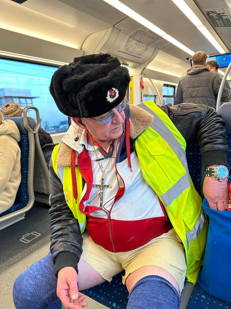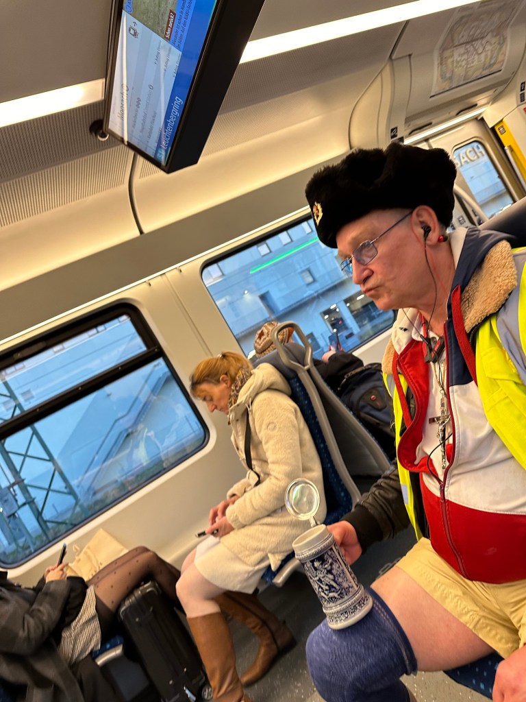 The flight to Munich was quick. A train ride into the city center took around 45 minutes. Around half way through this fellow came and sat across from me. A bit drunk and speaking Russian he pulled out a bottle of Smirnoff took a few pulls then put it back in his bag. He then pulled out a beer stein and a can of beer and proceeded to fill the stein with the beer. I guess the lid prevents spilling? I guess it is Friday night in Munich…