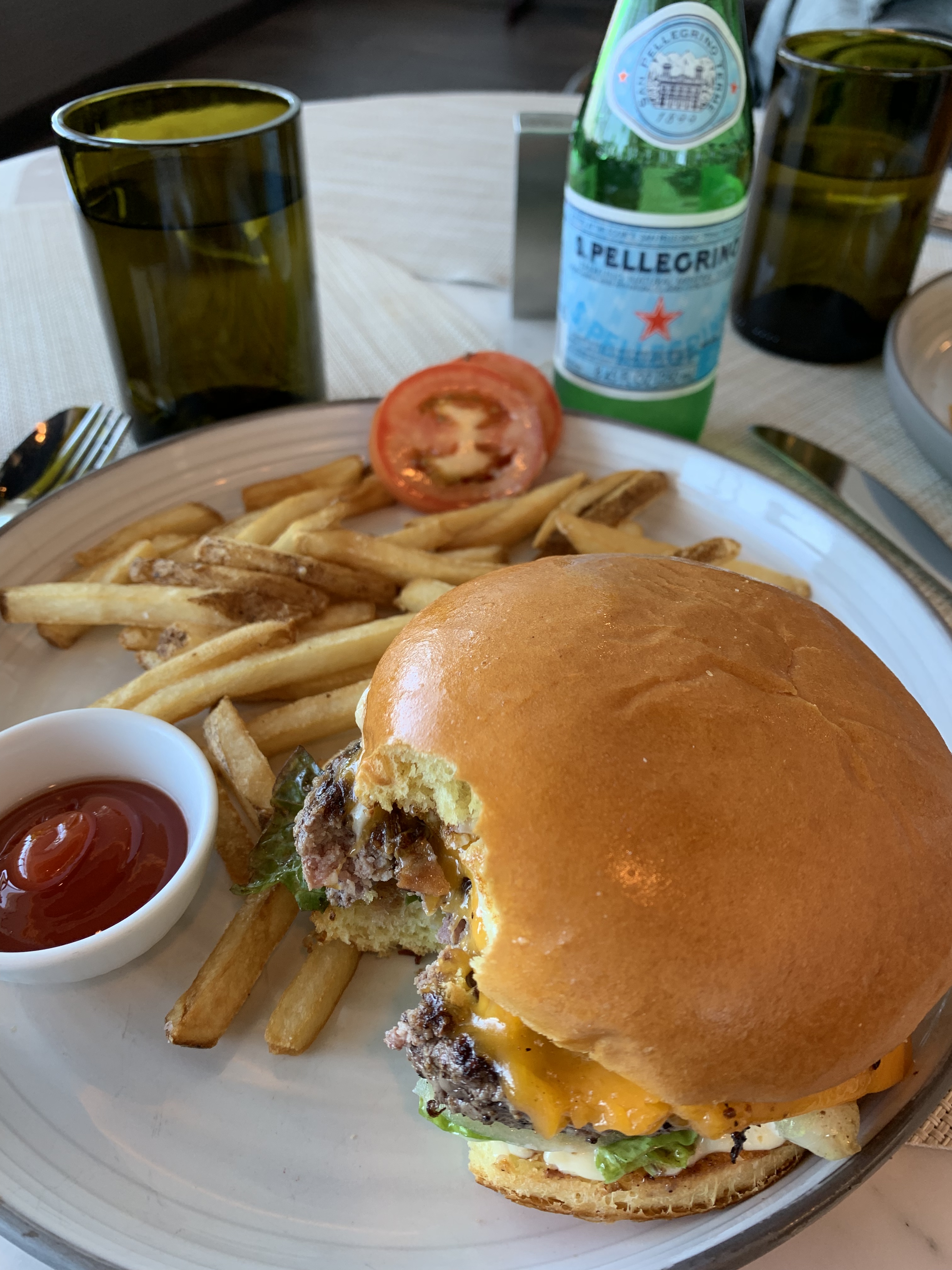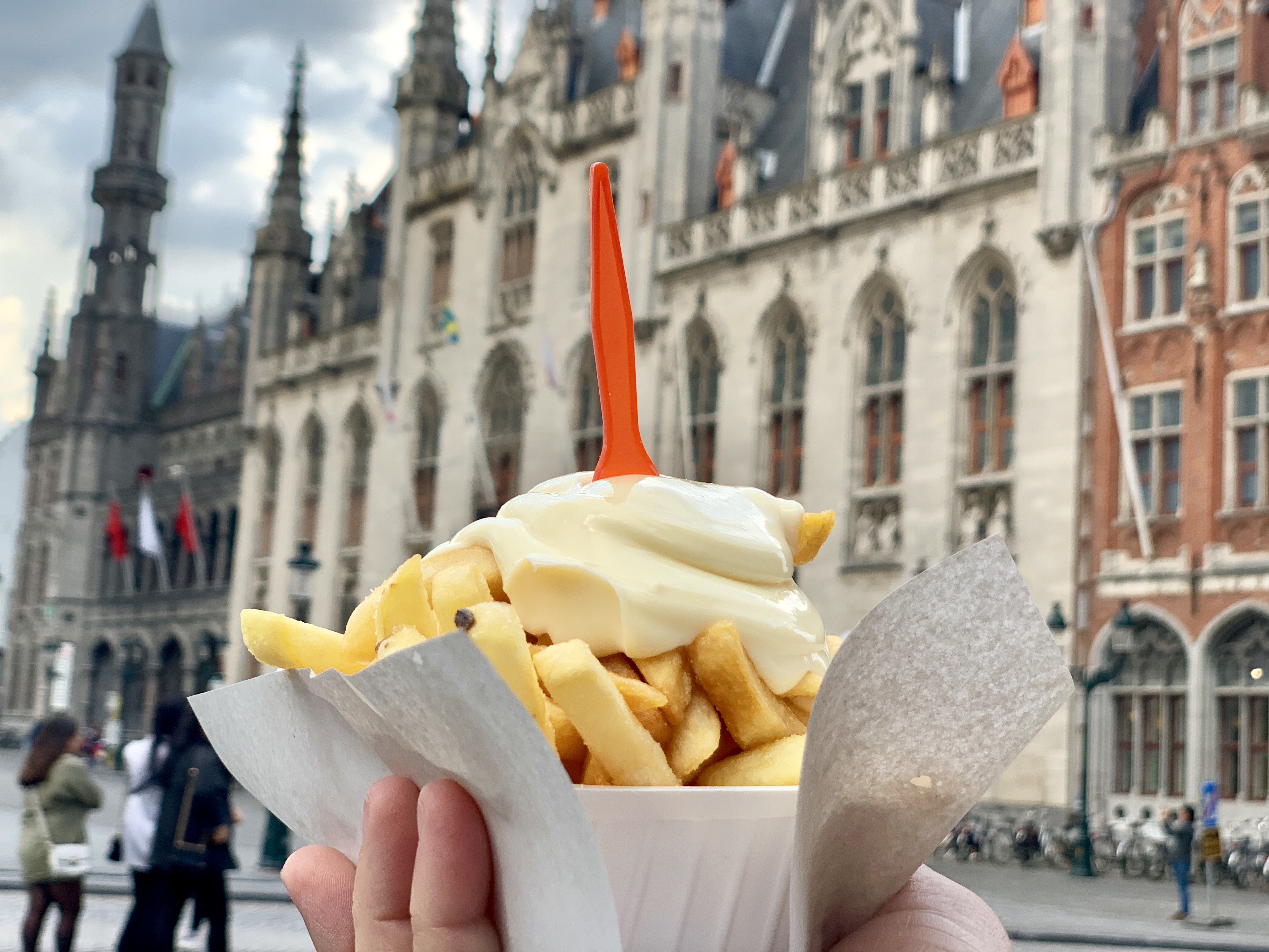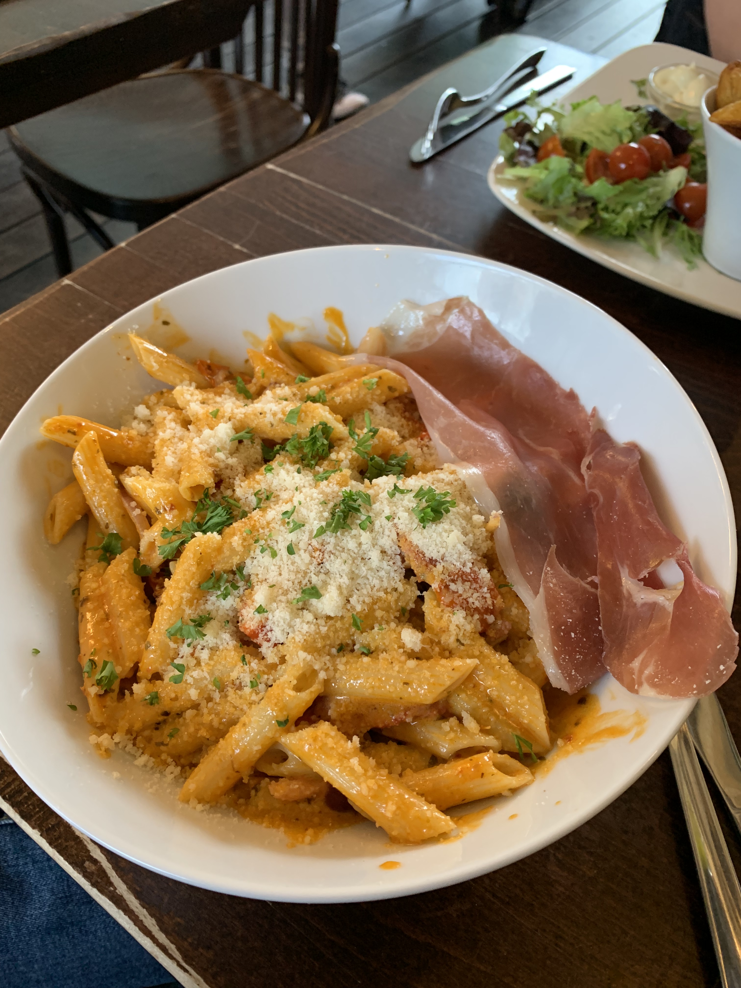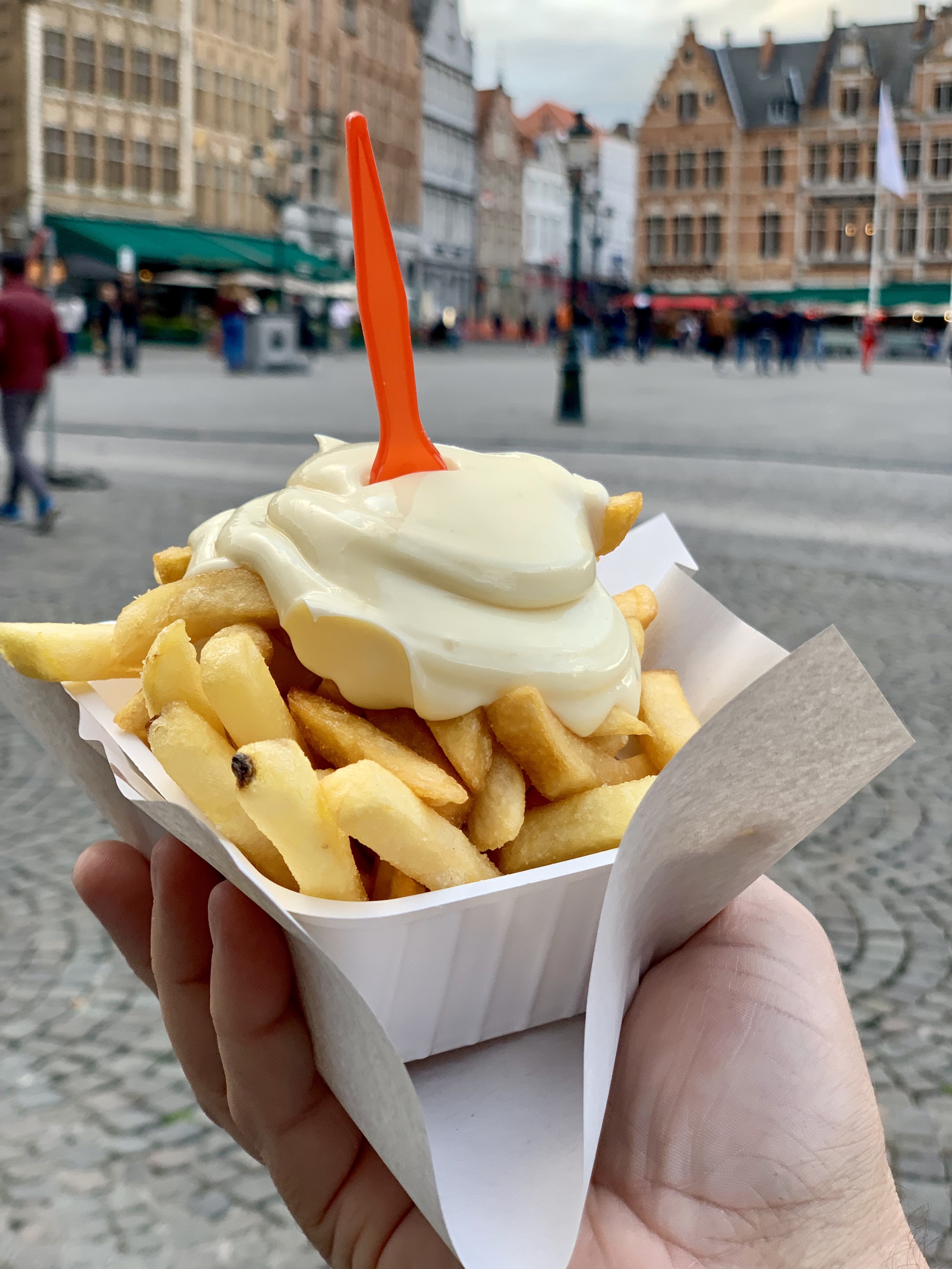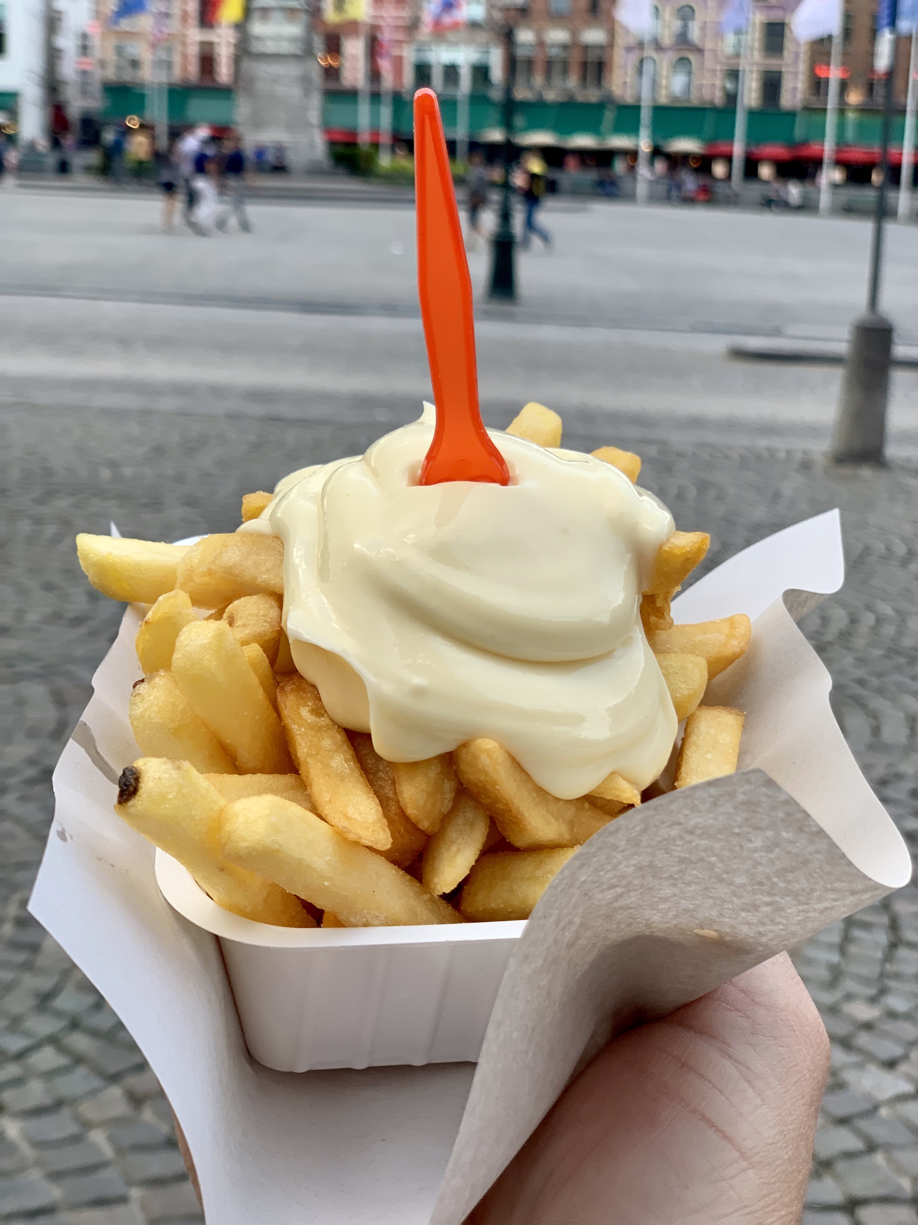 I had penne pasta with a pesto sun-dried tomato sauce with prosciutto. Mike had a yummy beef stew. And frites. With Mayo. (I think he’s hooked.)