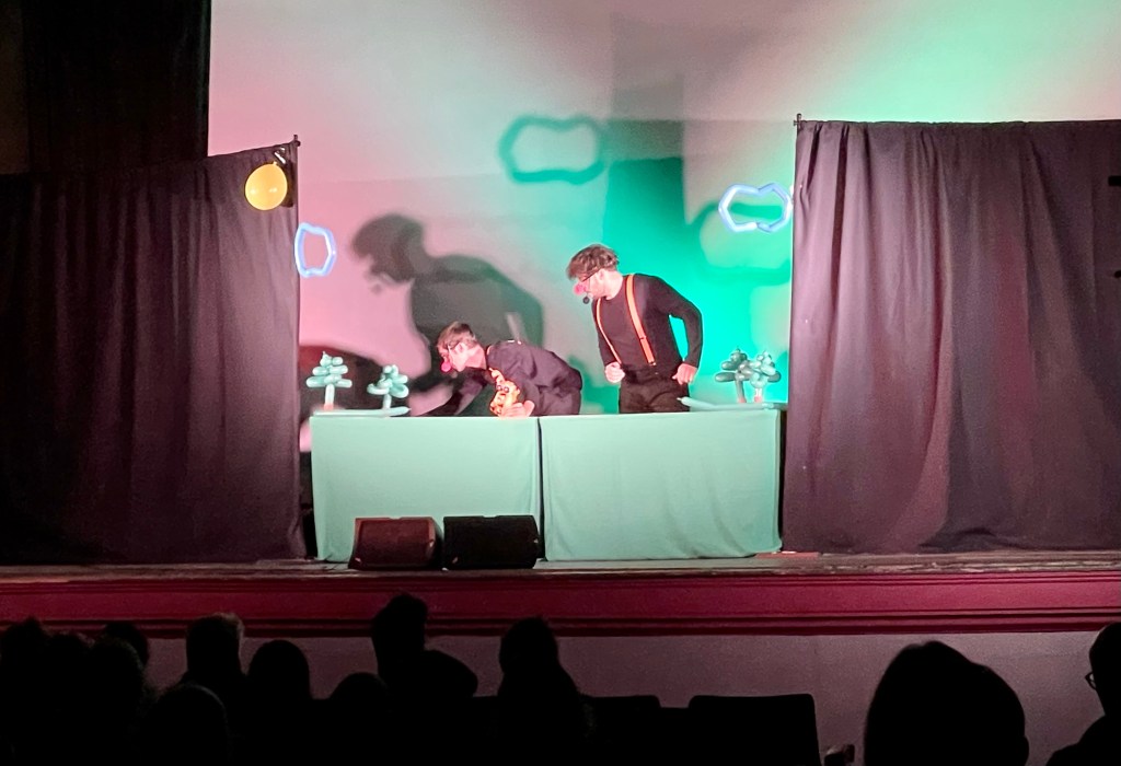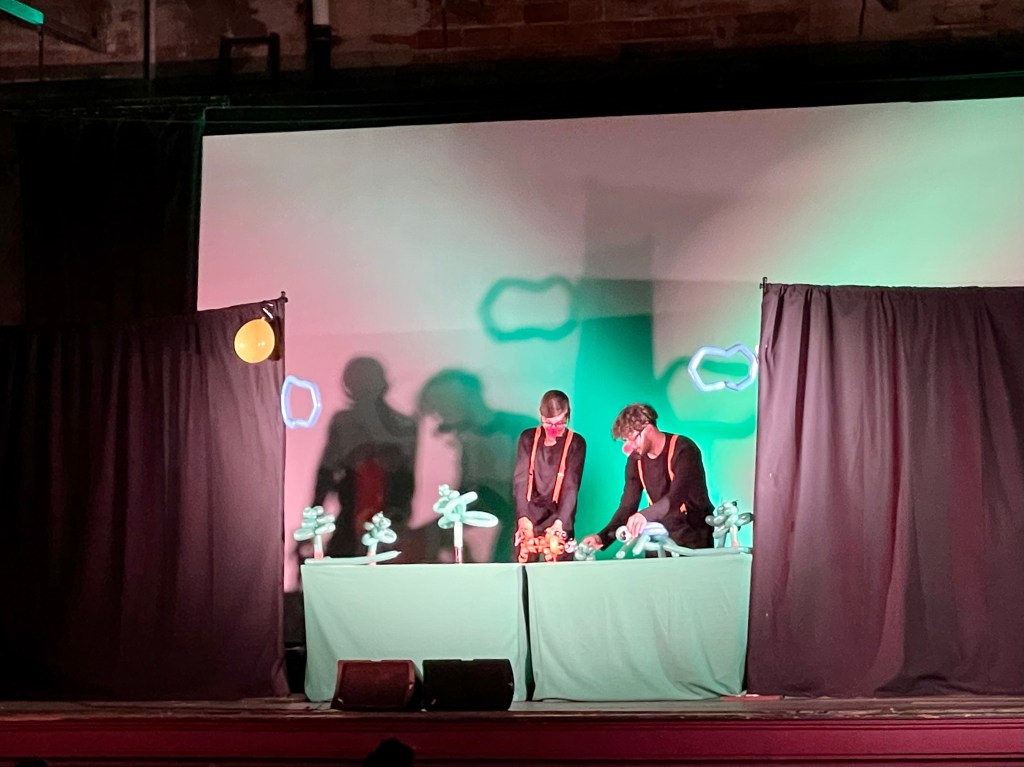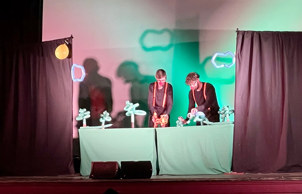 The Show was well rehearsed, clever and well directed. They didn’t lean too heavily on their use of balloon animals as puppets though they did capitalize on it. I was wondering if it was going to be too gimmicky. It was not. The same tale could have been told with regular puppets but they enhanced it with the clever use of balloons. They were very much physical comedians (Bill Irwin type clowns) but let the puppets have the primary focus most of the time. It was a really neat to see them give the puppets away to the audience at the end of the performance. Again, very clever.
