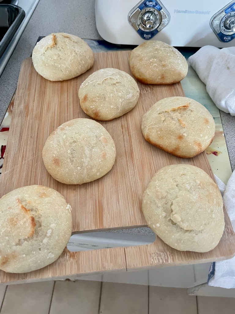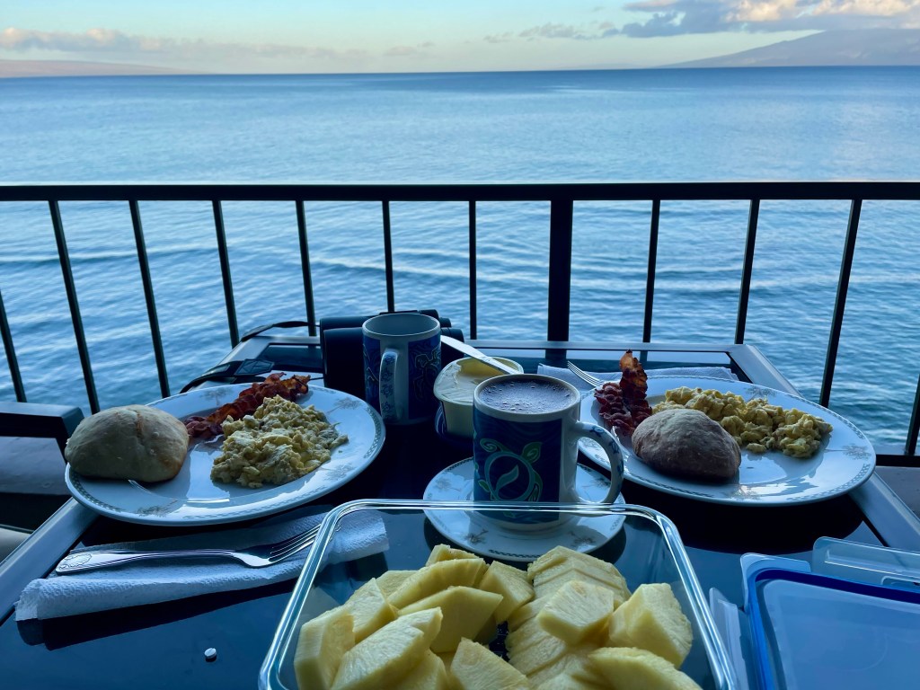I made rolls from scratch. They were just ok. The oven in the condo is very different from our home oven. The rest is eggs, bacon and Maui Gold pineapple Mike chopped up for us.