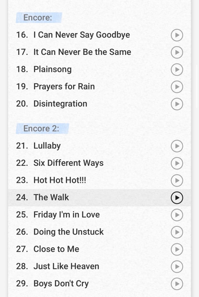 Why am I including this concert in my blog? I’m counting last night as the beginning of this vacation. I attended The Cure in concert at Shoreline Amphitheater and it was incredible. The show was sold out with around 22,000 people in attendance. They played three sets, a total of 29 songs. I researched some of the recent playlists from their Southern California shows so I could get an idea of the songs they’d be playing. (I do this regularly for concerts. I like to hear any songs I might not be familiar with. I generally make an Apple Music playlist to become familiar with the setlist.) I’m really glad I did this because I’m a casual Cure fan, familiar with a dozen or so songs. They went deep into their 40 year catalog and played songs I wasn’t too familiar with until my research. I found some new favorites from their setlist and it was great to see them play these new favorites live.