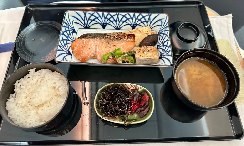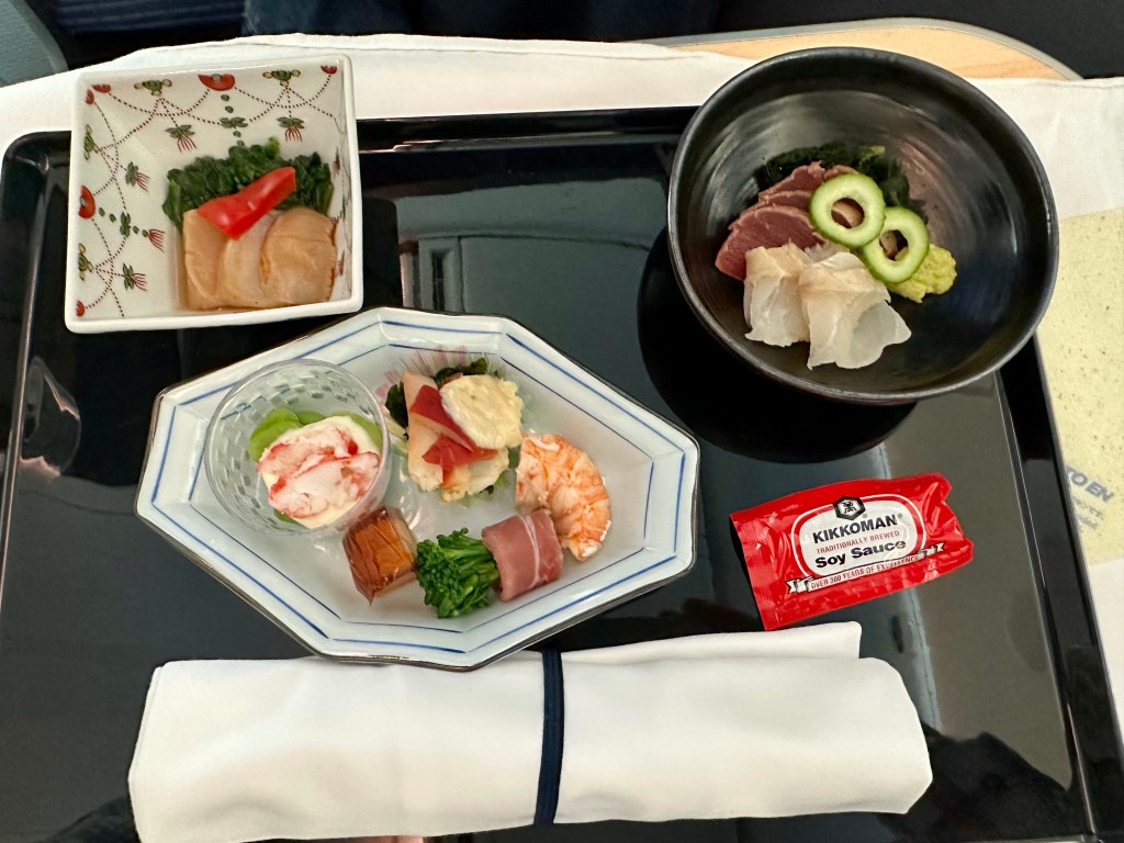 The flight attendant noticed I didn’t care for the mackerel so she brought me delicious halibut and shrimp.