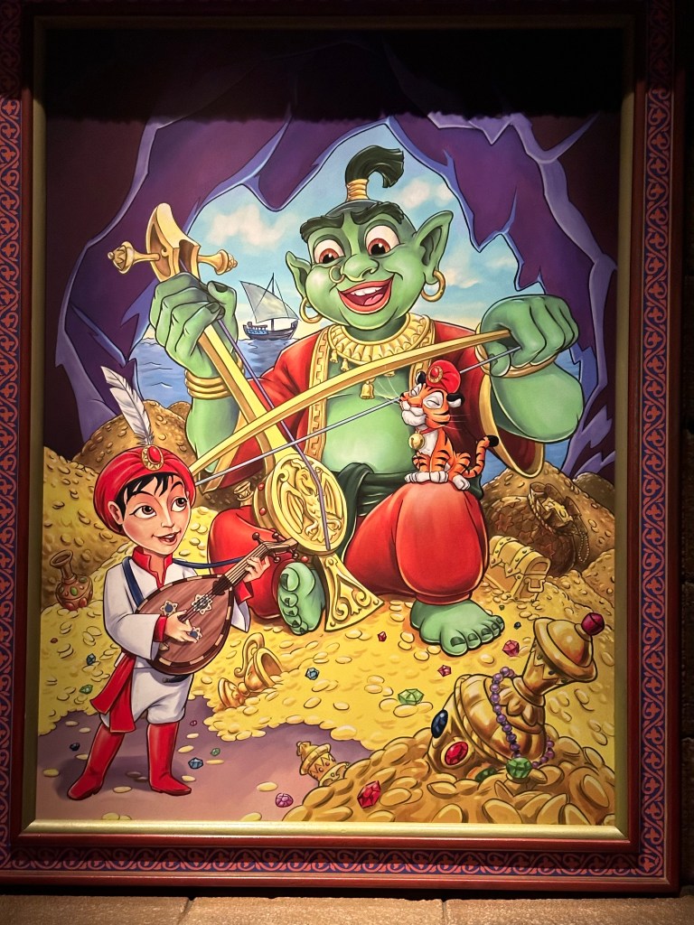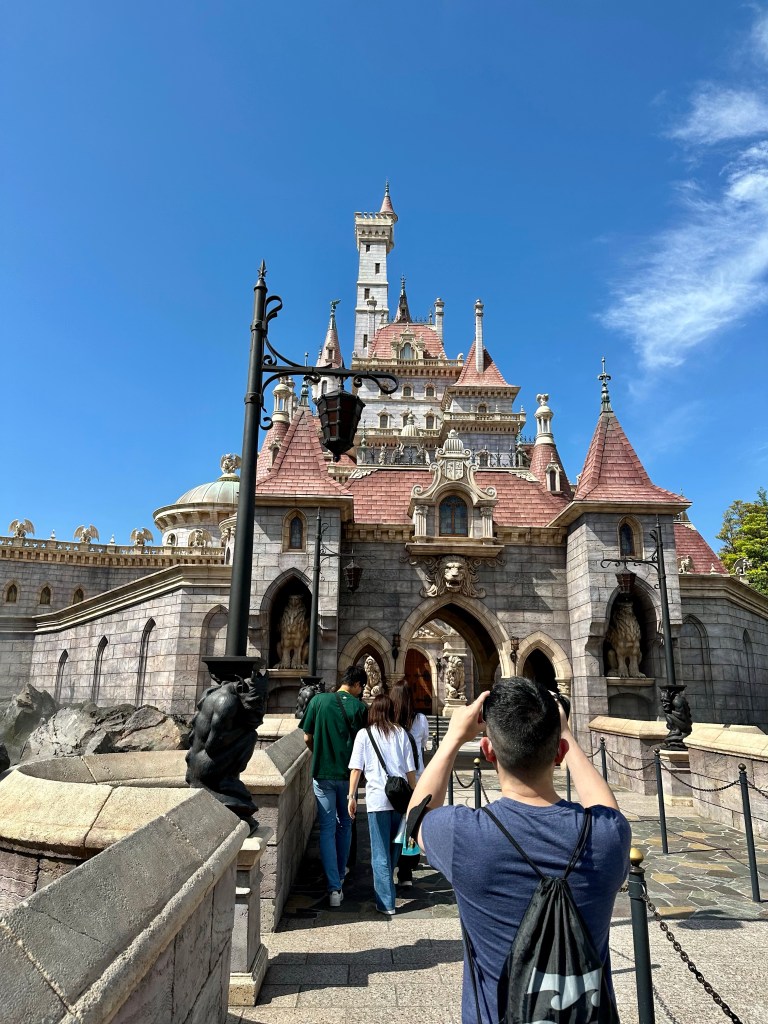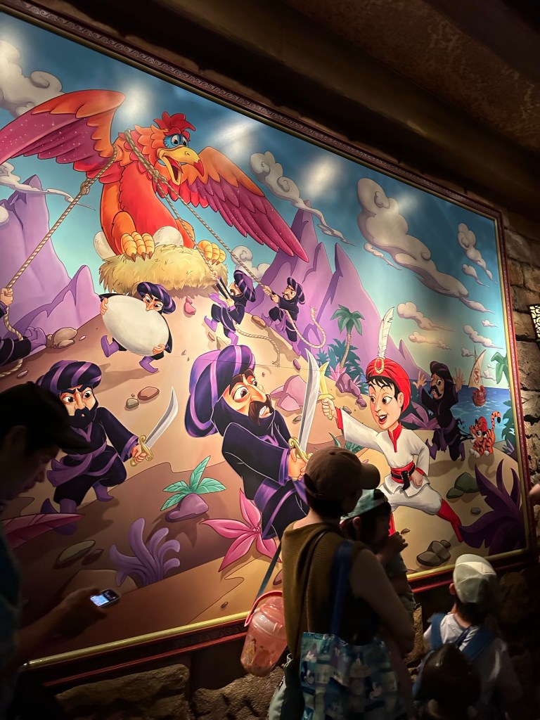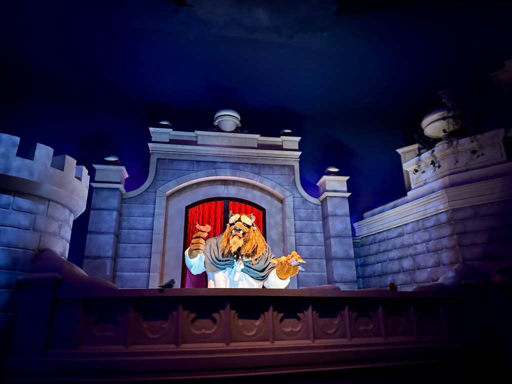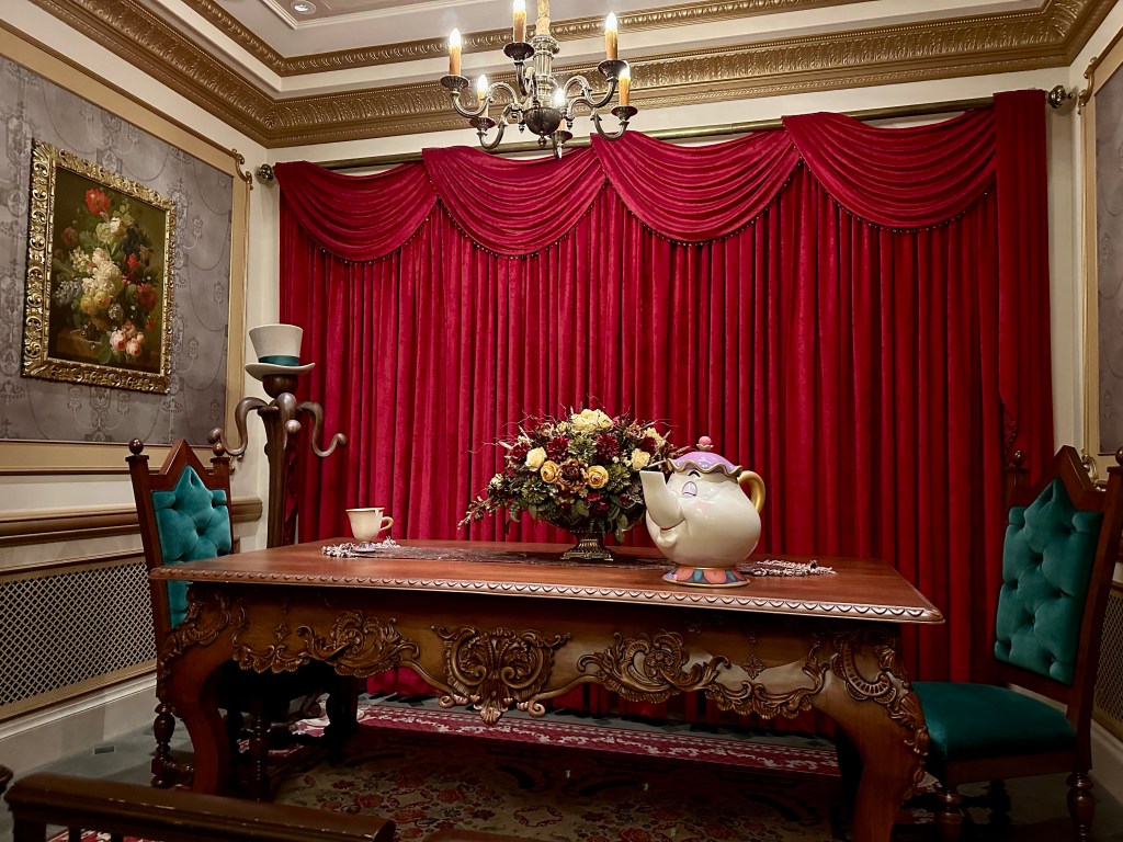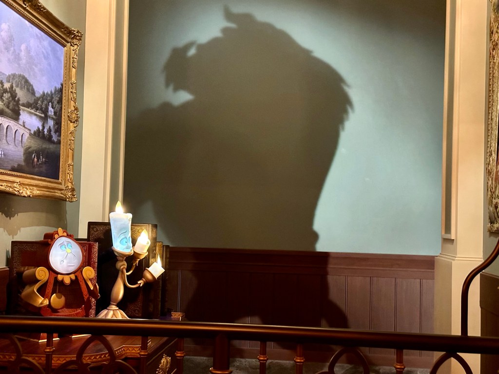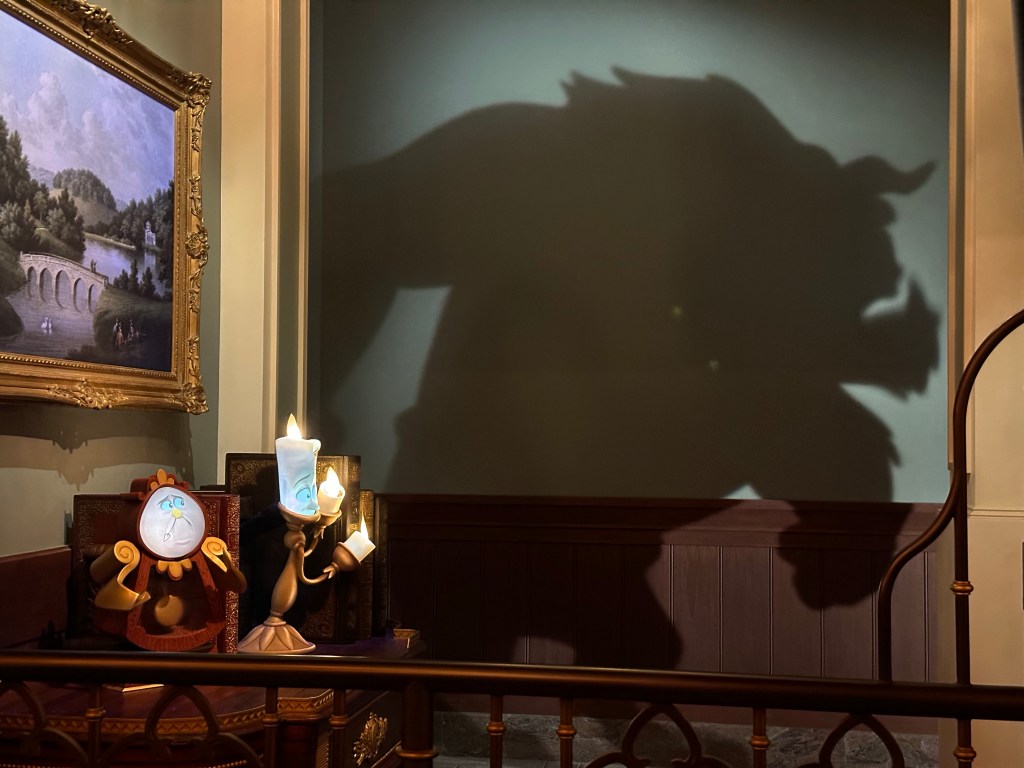 The queue is beautifully designed and you see the teapot and the candelabra arguing with the Beast (his shadow) in Japanese. I think they’re telling him to get his shit together. (I’m not super familiar with this movie. Not my fav.)