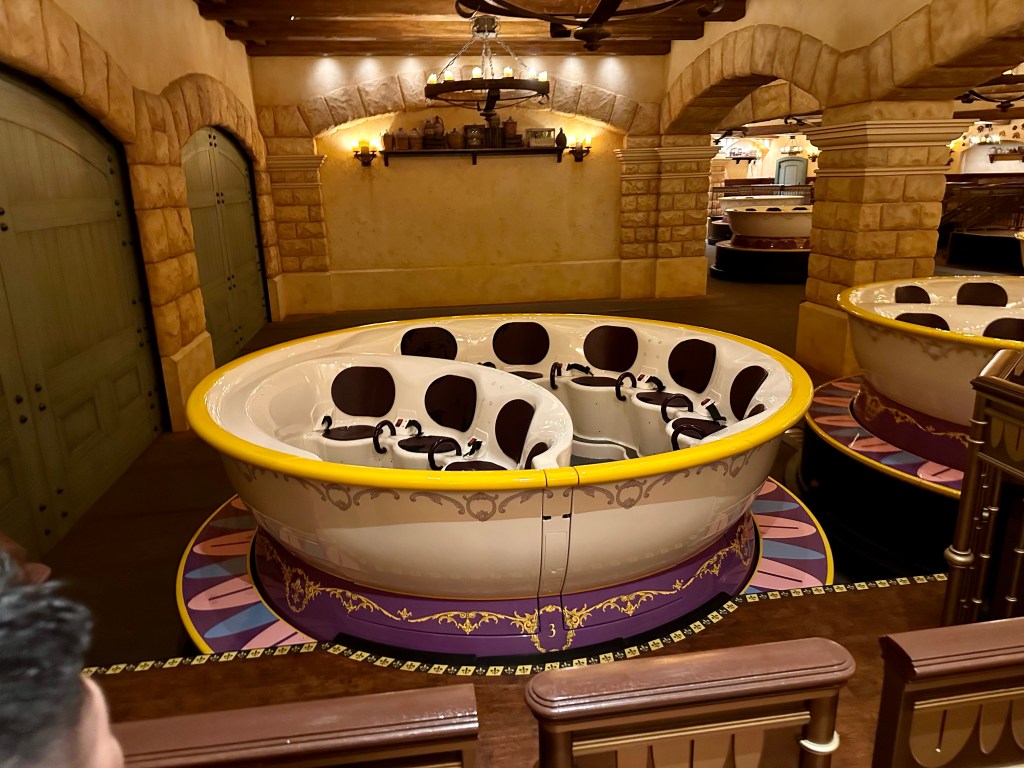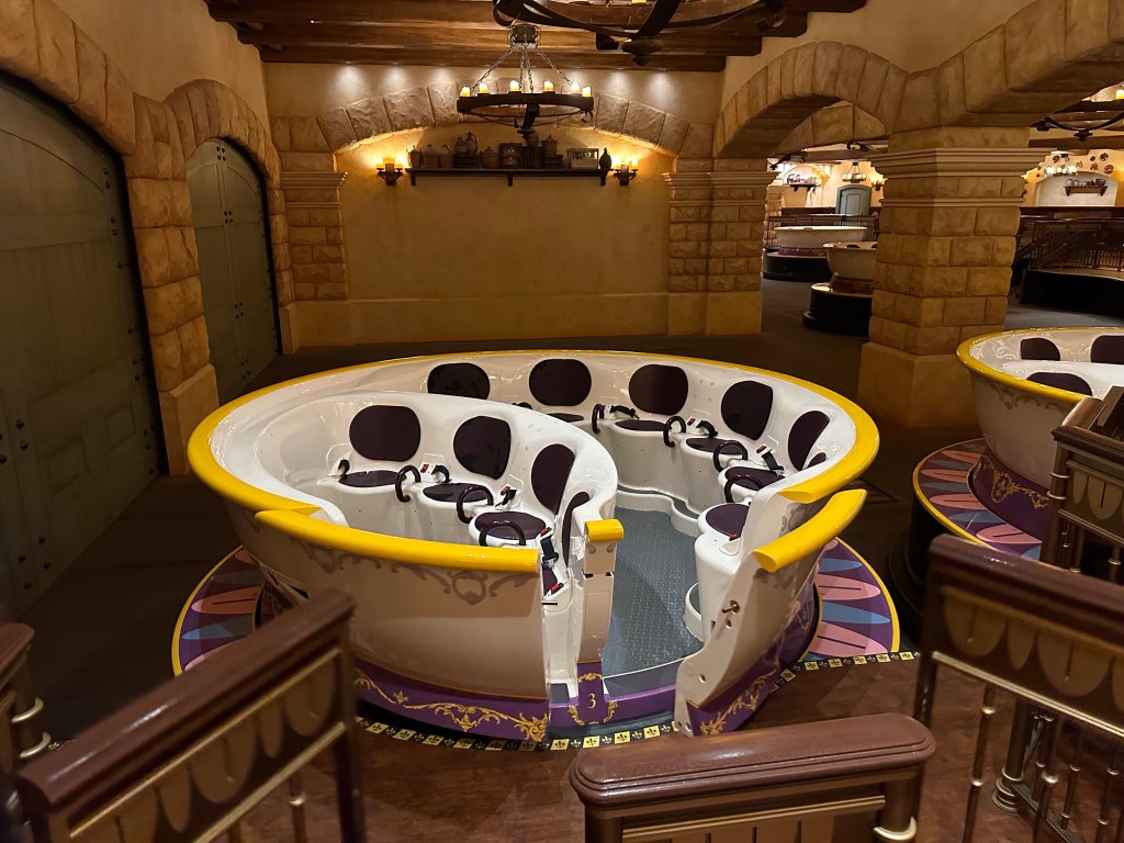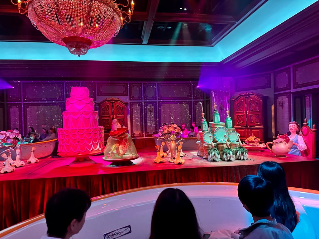 As the actual ride starts you enter the story at the feast (Be Our Guest song) then the a Beast and Belle are getting to know each other. The animatronics are top notch and the ride vehicles are trackless vehicles designed to look like big dishes.