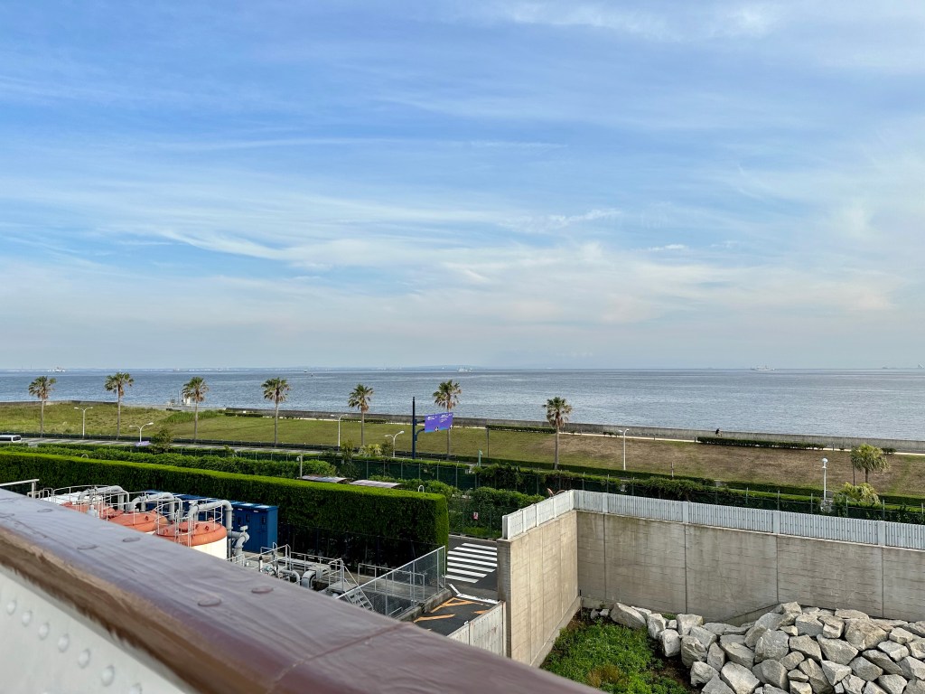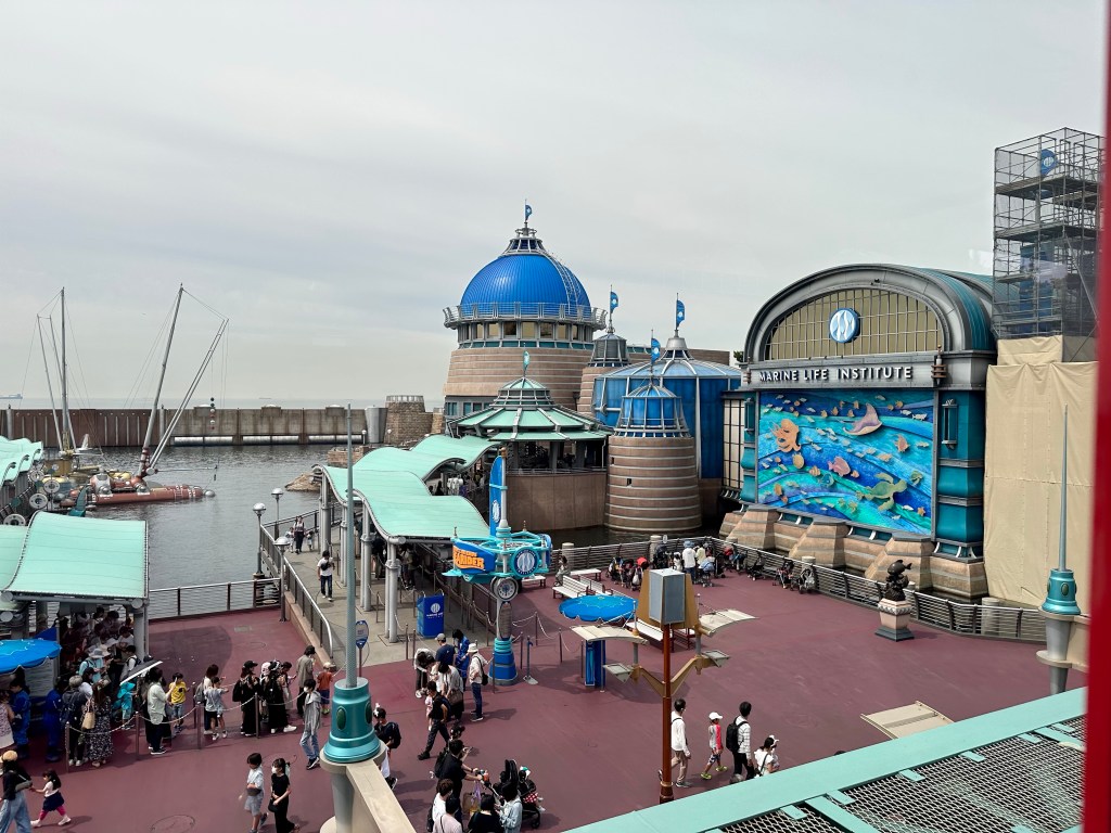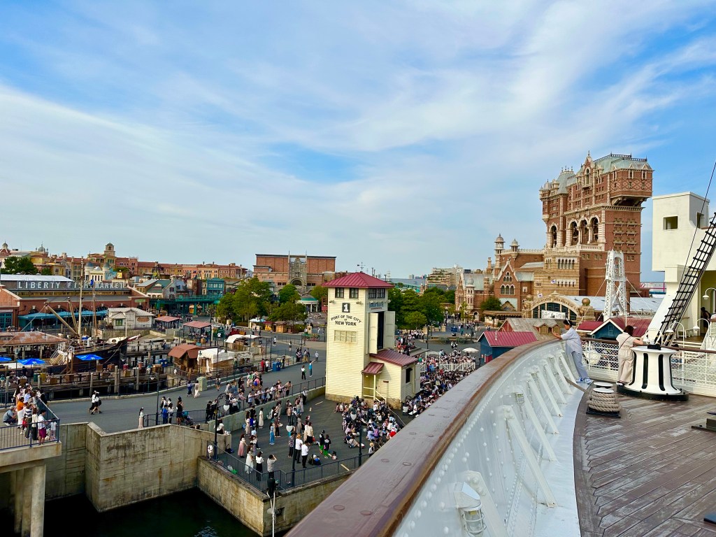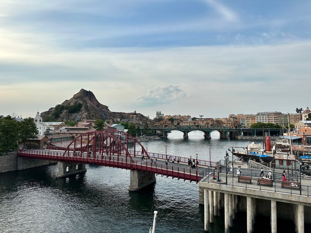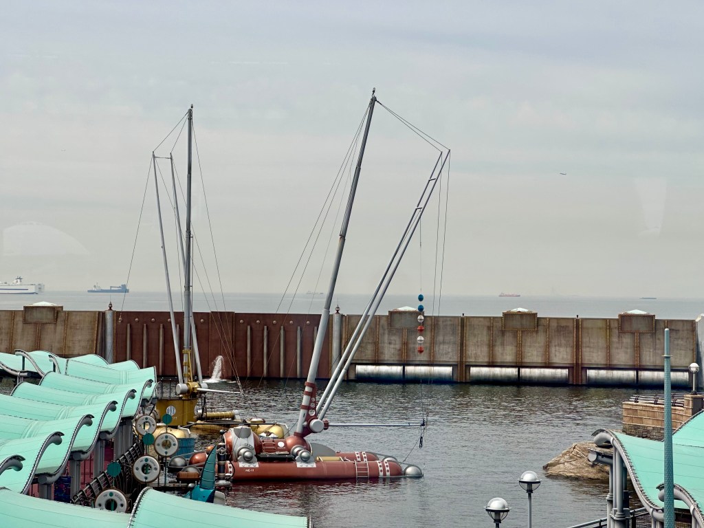 Disney Sea is located right on the water, Tokyo Bay, and from many parts of the park you can actually see the ocean. It looks like it’s right on the water. In fact, there’s a monorail and road between the park and the water but they use some clever tricks to make it seem closer. like this.