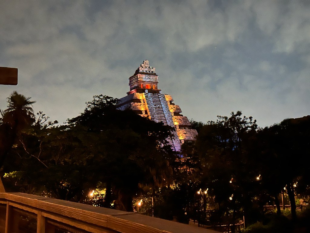 The ride is very similar to the Anaheim ride with the exception of a smoke ring blowing effect that is terrific. The theming for the outside of the ride is a spectacular Mayan Pyramid. Here’s some photos from later that evening.