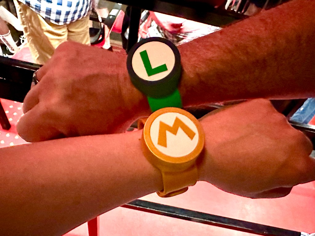 We grabbed “power up bands” which allowed us to punch underneath blocks, play little challenges and ride the rides all to collect coins…like you would in a video game. The “score” was kept in a phone app.